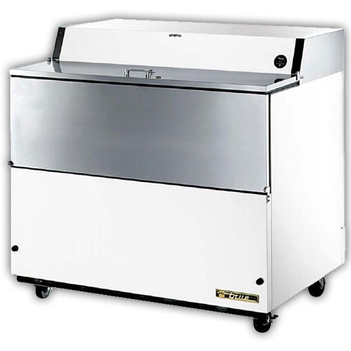 49" True - Single Sided Milk Cooler - 12 Crate - Forced Air Refrigeration - White Vinyl Exterior - TMC-49 The highest quality materials and oversized refrigeration systems provide the user with colder product temperatures, and lower utility costs in an attractive and durable school milk cooler. • Oversized, forced air refrigeration system maintains milk temperatures of 33°F to 38°F (.5°C to 3.3°C). • All stainless steel self-service doors feature convenient drop front and "hold-open" flip-up top. Standard with door locks. • Standard with heavy duty floor racks and convenient clean out drain. • Reinforced floor. • Entire cabinet structure and solid doors are foamed-in-place using high density, CFC free, polyurethane insulation. • Digital thermometer standard. Exterior: Stainless plus White Vinyl exteriorInterior: White Aluminum interior. Dimension: All units are 33-1/4" Deep x 41-5/8" Tall Single Sided / Two Doors: Accessible from one side with flip-up Top and drop Side doors. Warranty: 1 Year Parts and Labor Warranty with 5 Year Compressor WarrantyElectrical: 115 Volts